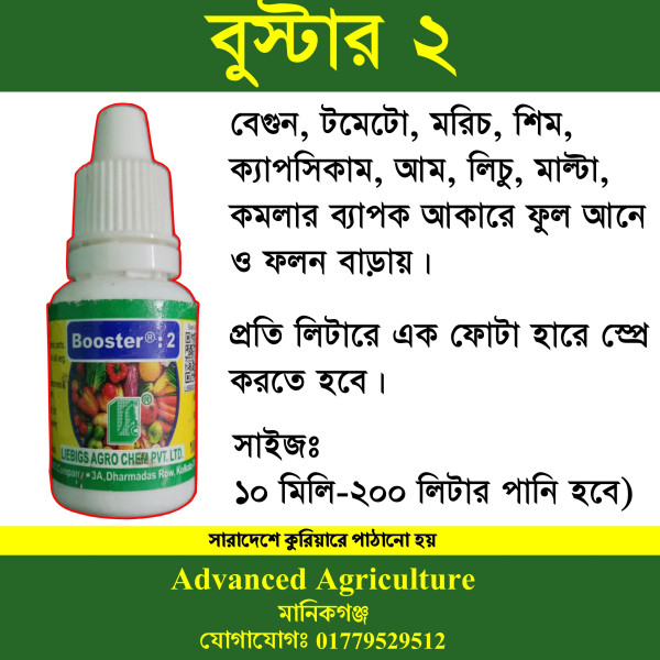 পানিতে ৮-১০ ফোঁটা বুস্টার-২ প্রথম ফুলের কুঁড়ি এলে ১ বার এবং পরে ১৫ দিন পর পর একই